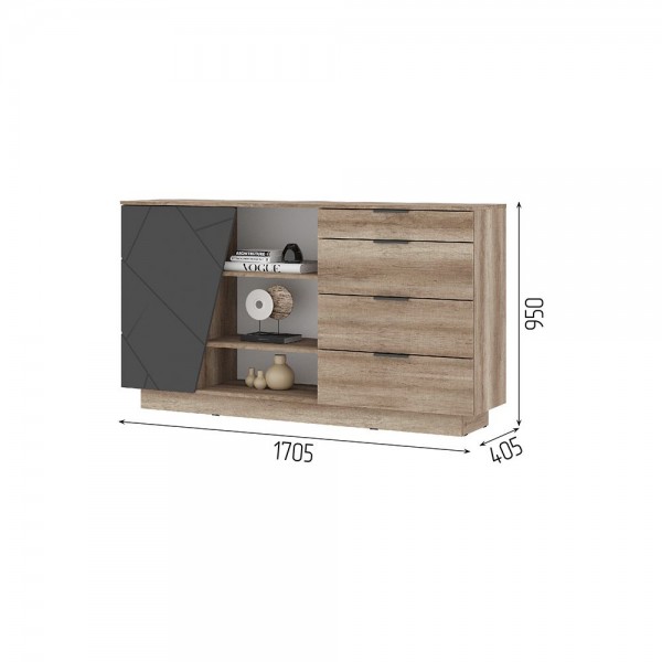 Размер (ШхВхГ) 1705х950х405 мм ФАСАД МДФ СОФТ ГРАФИТ/КОРПУС ДУБ КАНЬОН Материал: корпус - ЛДСП, фасад - МДФ.