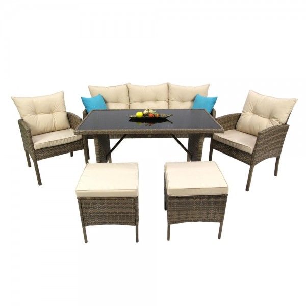 Габариты элементов (ШхГ/ДхВ) : Трехместный диван:161x67x78 Кресло:60x67x78 Обеденный стол:120x64x70стул:38x38x40 Дополнительные декоративные подушки: 2шт.Цвет каркаса : коричневыйМатериал каркаса : стальЦвет чехла мягкого элемента/матраса : бежевыйУзор ткани : без рисункаМатериал чехла мягкого элемента : водоотталкивающая тканьТолщина мягкого элемента : 50Цвет поверхности : коричневыйМатериал поверхности : искусственный ротанг, стеклоКомплектация : стол+диван+2 стула+2 кресла ротанг кор., подушки бежевые+декоративные подушки 2штИспользование на открытом воздухе : даСтрана производства : КИТАЙДополнительно : диван,кресло,стул,стол+декоративные подушки 2 шт.: размер 40х40 см