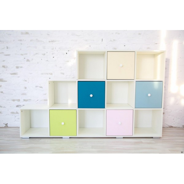 Стеллаж сделан в виде ступенчатой лестницы состоит из 12 модулей, где 7 - открытых и 5 - с дверками