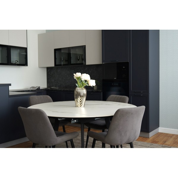 Материалы: столешница из керамогранита на металлическом основании. Поверхность устойчива к царапинам, перепадам температур и воздействию влаги. Керамогранит не требует сложного ухода и сохраняет эстетичный вид в течение многих лет.