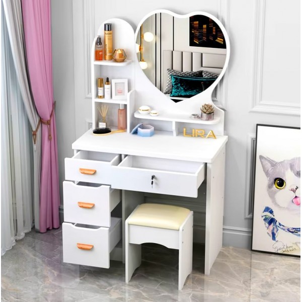 Туалетный стол с зеркалом в виде сердца не только красив, но и практичен. Он станет вашим незаменимым помощником в утренних процедурах, создавая уютную атмосферу. Пуфик в комплекте добавляет комфорта, позволяя вам расслабиться во время подготовки к выходу. Идеально подходит для спальни, гардеробной или туалетной комнаты.